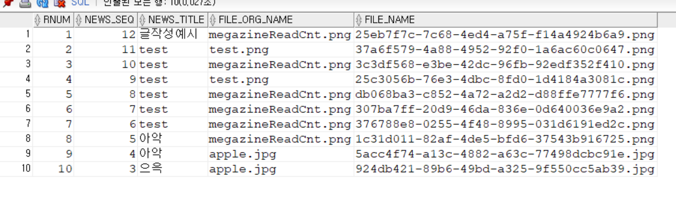 이렇게 그대로 작성해서 서버를 돌려 실행해보니 가장 최근의 글 news_seq 12에 지금까지 작성한 news_file에 있는 데이터에 대한 fileName이 돌아가며 찍혔다.